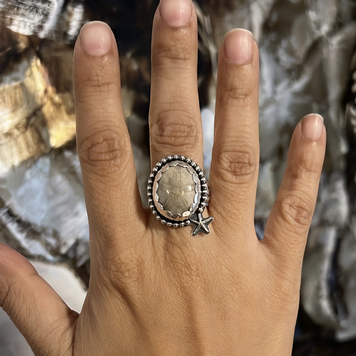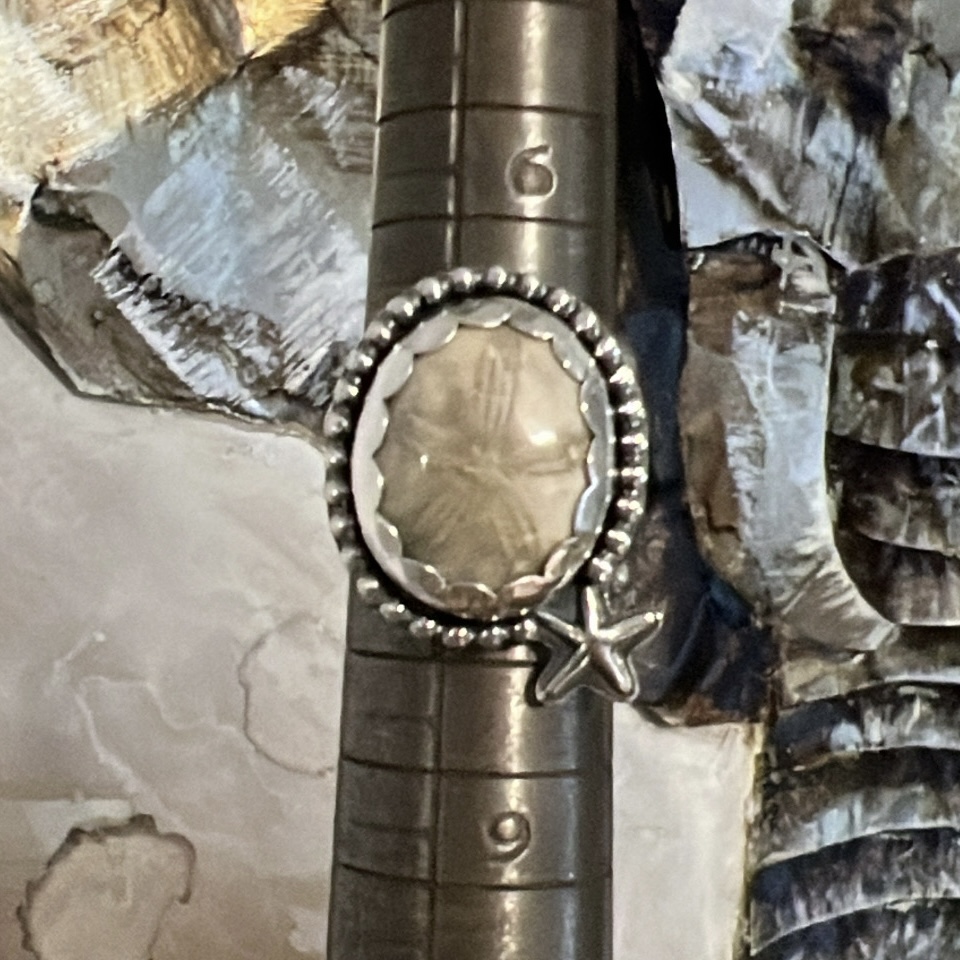 Sterling Silver (.925) Handmade Ring with a fossilized Sand Dollar and small silver starfish detail.